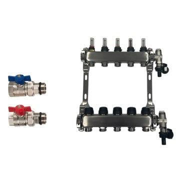 Edelstahl Heizkreisverteiler für Fußbodenheizung 5 Heizkreise inklusive Kugelhahnset gerade Anschluss