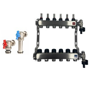 Edelstahl Heizkreisverteiler Fußbodenheizung 6 Heizkreise inkl Kugelhahnset Eck Anschluss Lang