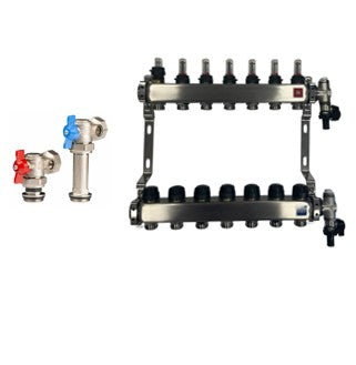 Edelstahl Heizkreisverteiler Fußbodenheizung 7 Heizkreise inkl Kugelhahnset Eck Anschluss Lang