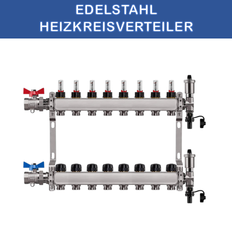 Distribuitor de circuit de incalzire din otel inoxidabil pentru incalzire in pardoseala. 8 circuite de incalzire. Debitul și returul sunt compensate pentru o mai bună instalare a conductelor.